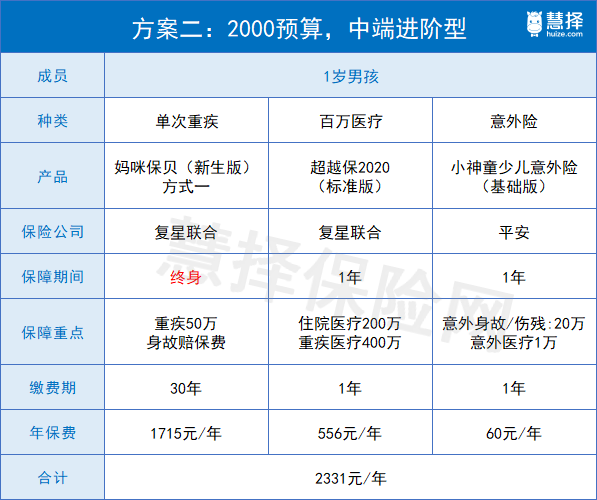 所以,家庭如果不是预算特别紧张,可以调整为保终身型,费用增加1000元。【即中端进阶型,见方案二】