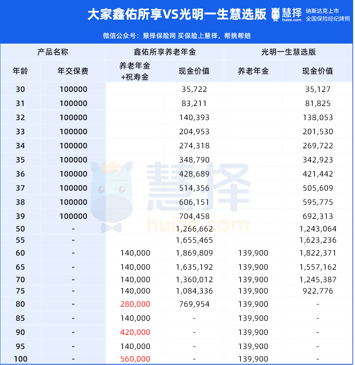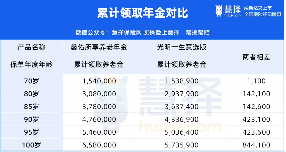 我们直接跟市场上热销的【光明一生慧选版】比,同样是保证领取20年。