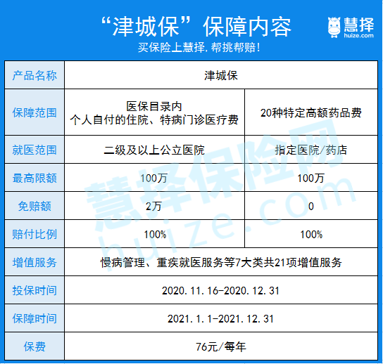我们从这里就可以看出:如果生病住院或是特病门诊,产生的医疗费用,医保报销后,对于医保目录内个人自付的部分,只要扣除2万元的免赔额,剩下的津城保还能进行100%报销。