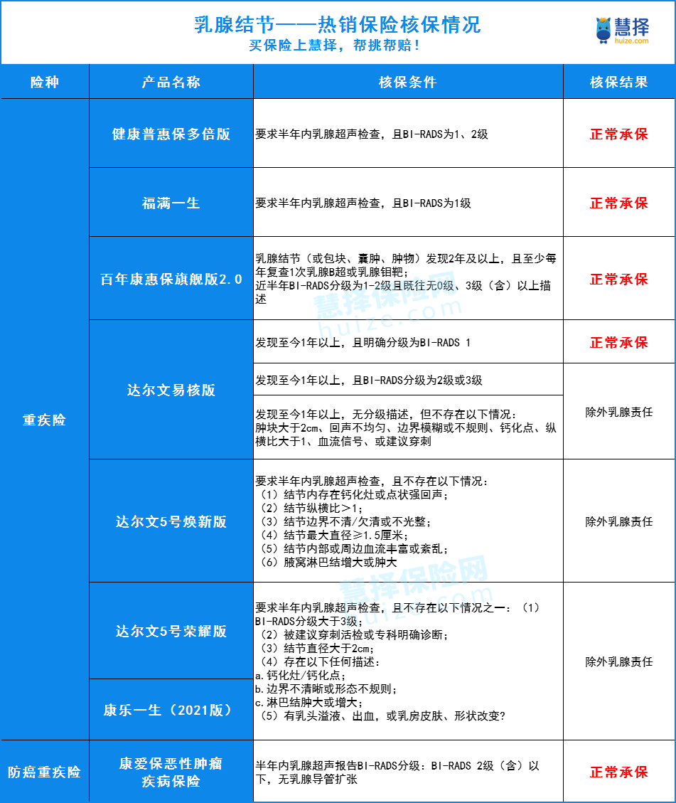 核心的癌症保障,保费便宜,有三高也能买。具体的产品像康爱保恶性肿瘤险,只要 半年内BI-RADS分级为2级以下,且无乳腺导管扩张,就可以正常承保。