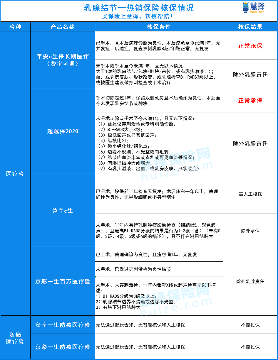 看表就能发现,医疗险对乳腺结节的核保要求不太统一。