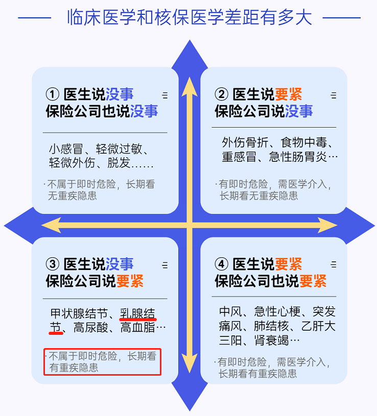 大择整理了一张【临床医学、核保医学】的区别,保险中使用的“核保医学”更多的是从长期疾病风险考虑。