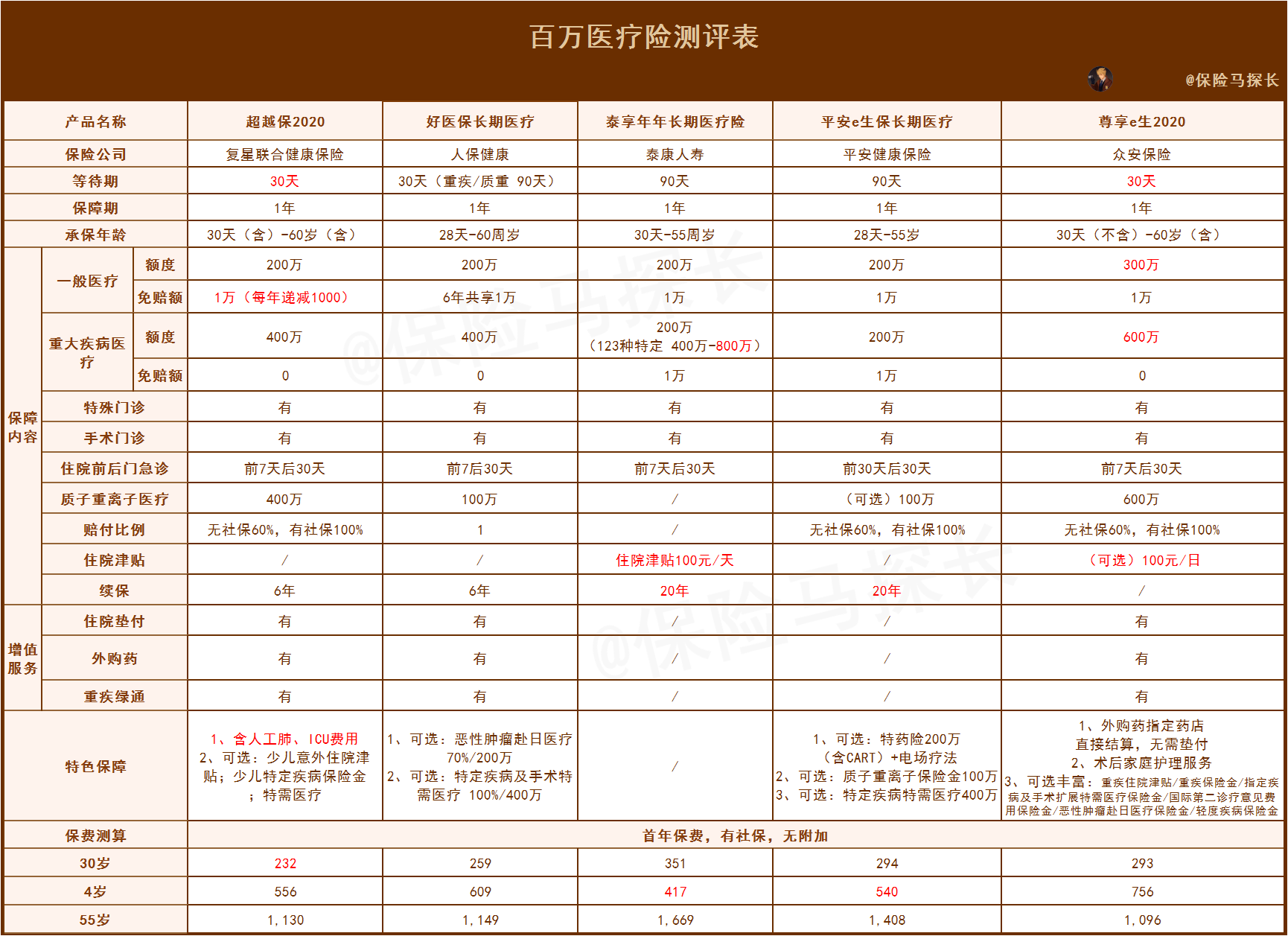 我们能看到,同样是6年期保证续保的产品。超越保2020 和 好医保长期医疗的区别主要在: